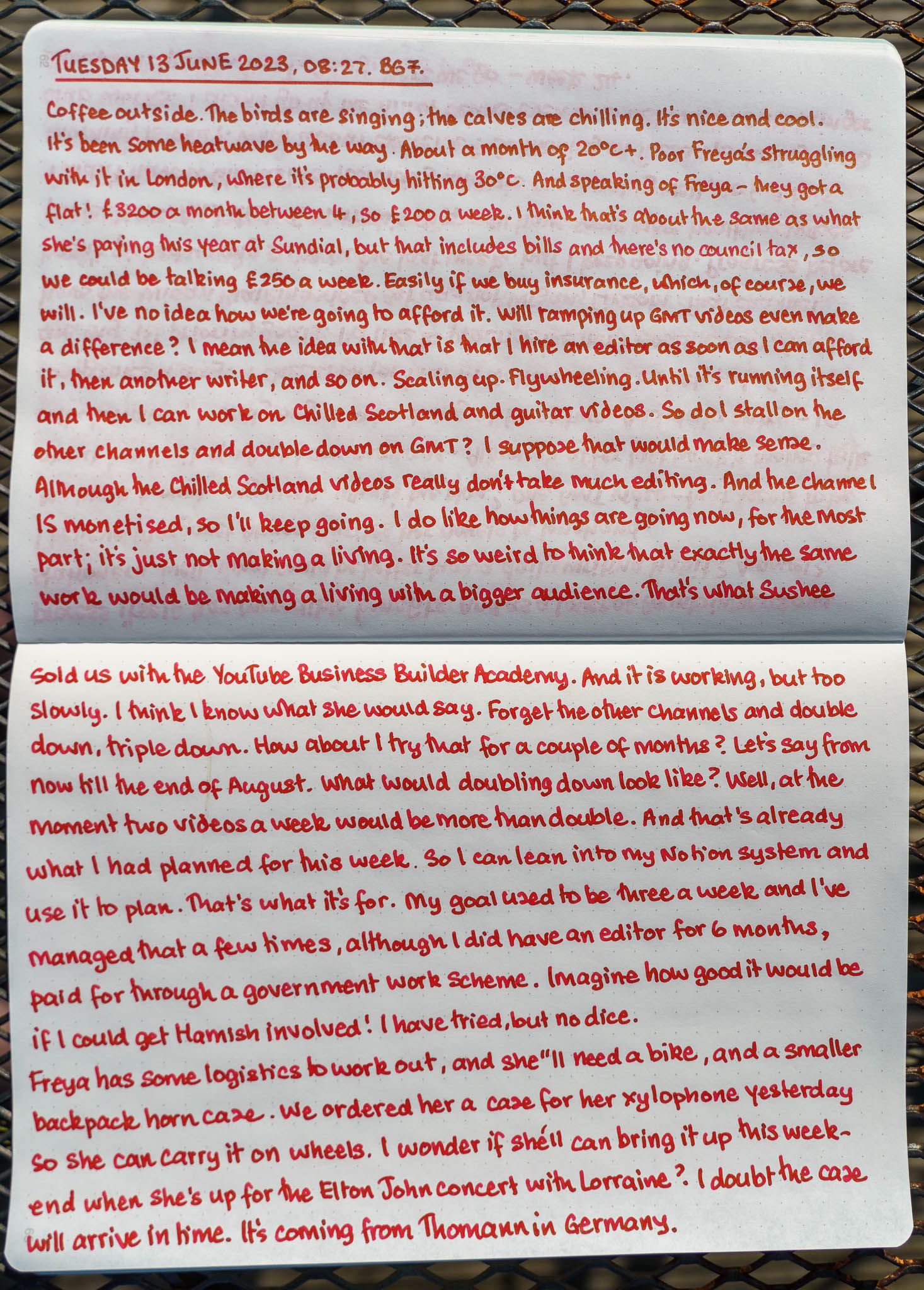 Another beautiful morning on Arran and a Morning Pages writing session outside on the rusty table with some coffee. Bliss. Today's writing was with the Waldmann Edelfeder broad with J. Herbin Hematite Rouge.