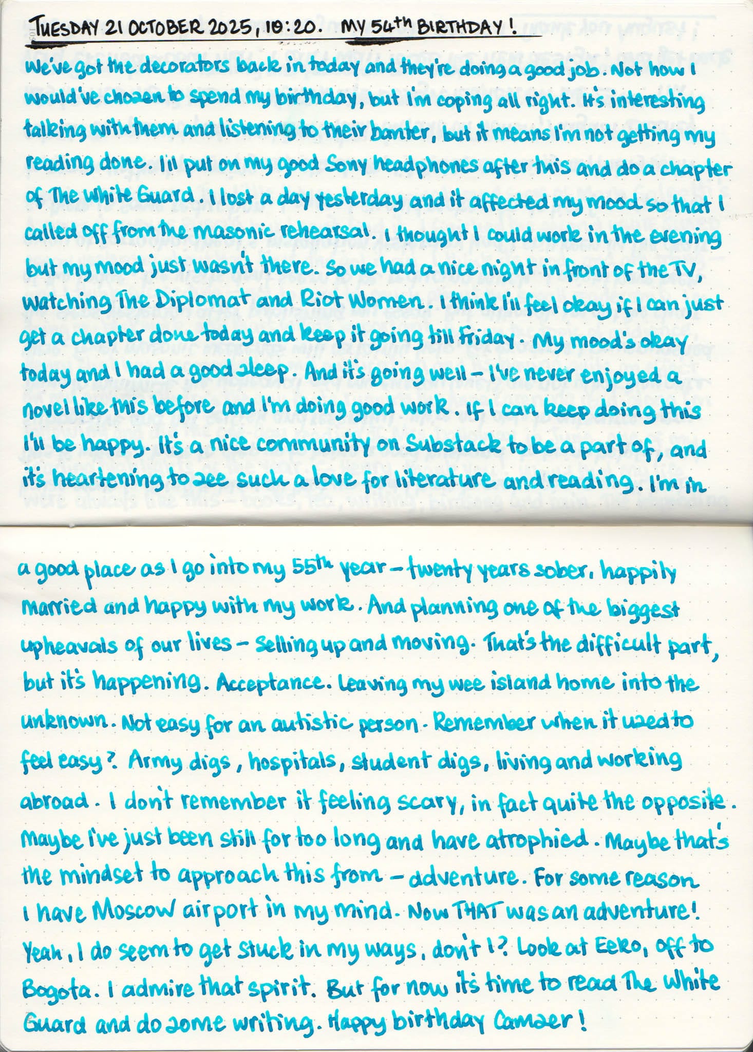 Oct 21, 2025 1 min read morning pages Morning Pages | 21 October 2025 54 today! Cams Campbell Some birthday writing while hiding from the decorators who are painting the hallway just outside my home office.Pelikan M600 Broad with Edelstein Apatite