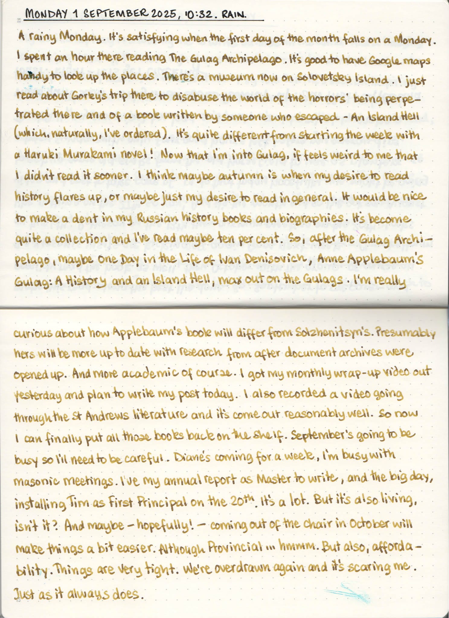 September, eh? The sound of rain coming in the window, the cat by my side and a cup of Earl Grey. And my books and stationery. What better way could there be to start a new month?