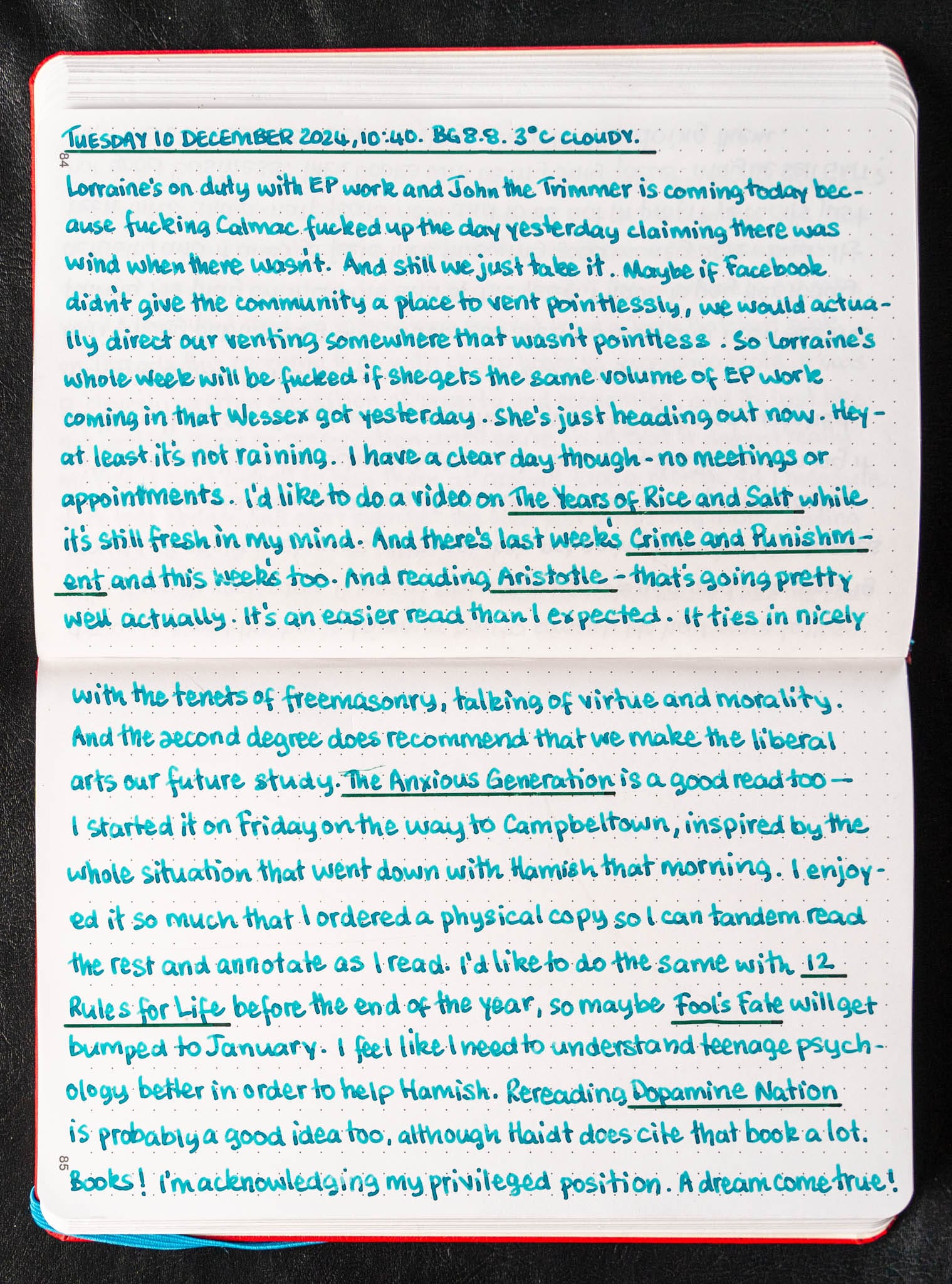 Hope punk — what a funny name for a genre. I have Ross and Laura’s TOP TEN reads of 2024 playing and seemingly Becky Chambers’ Monk & Robot duology is an example of hope punk. They make it sound well worth reading—and that’s the problem with BookTube: it makes me want to read EVERYTHING. Does anyone else feel that? That was why I stopped listening to The Incomparable podcast book episodes, and also to the Rich Roll Podcast. I want to read ALL THE BOOKS. Although had I not been listening to Rich Roll, I wouldn’t have bought and read Anna Lembke’s book that I mentioned in today’s pages, Dopamine Nation.