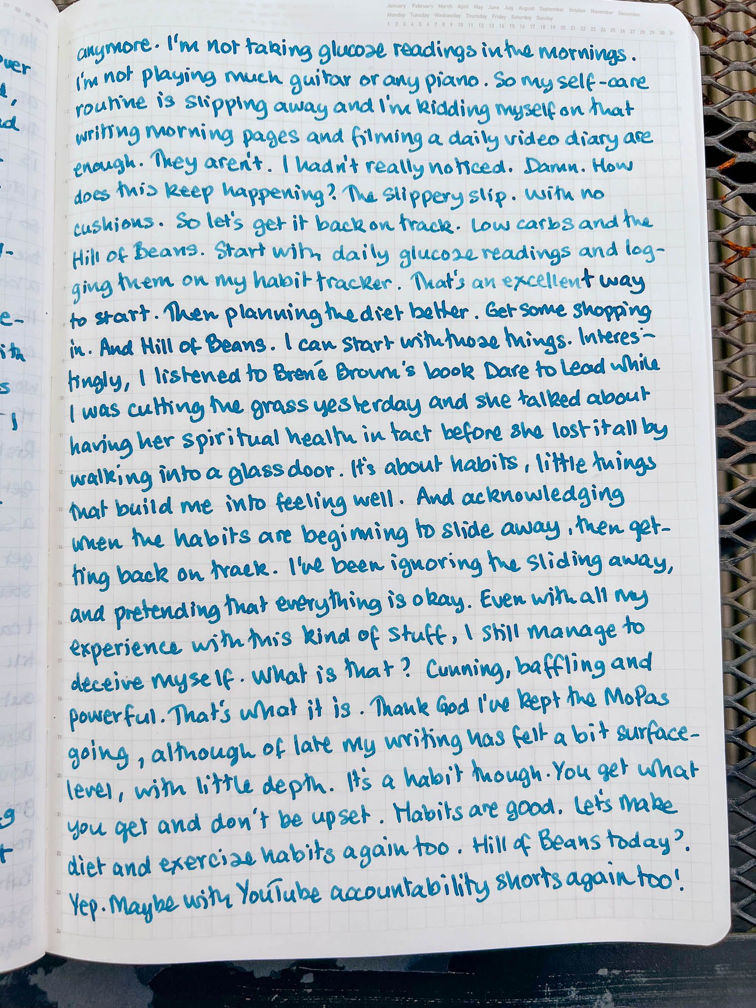 The topic of today's writing is about how slippery habits can be and how I hadn't really noticed that they were slipping. It's so good to get this down on paper and out of my head, so I get to see what's actually happening as I slide out of feeling well into self-destructive behaviour.