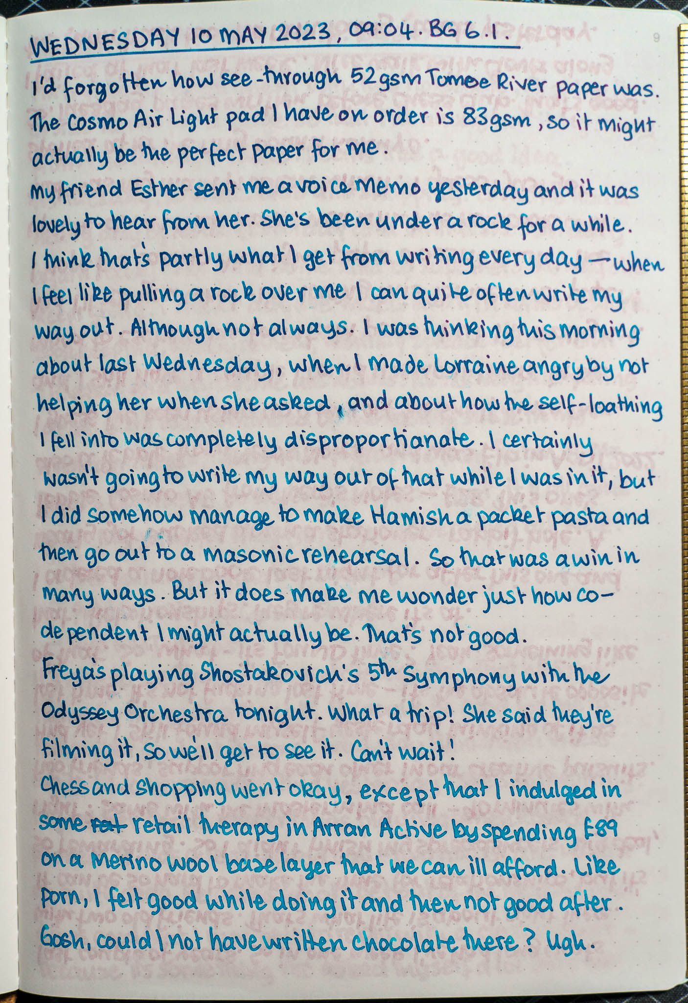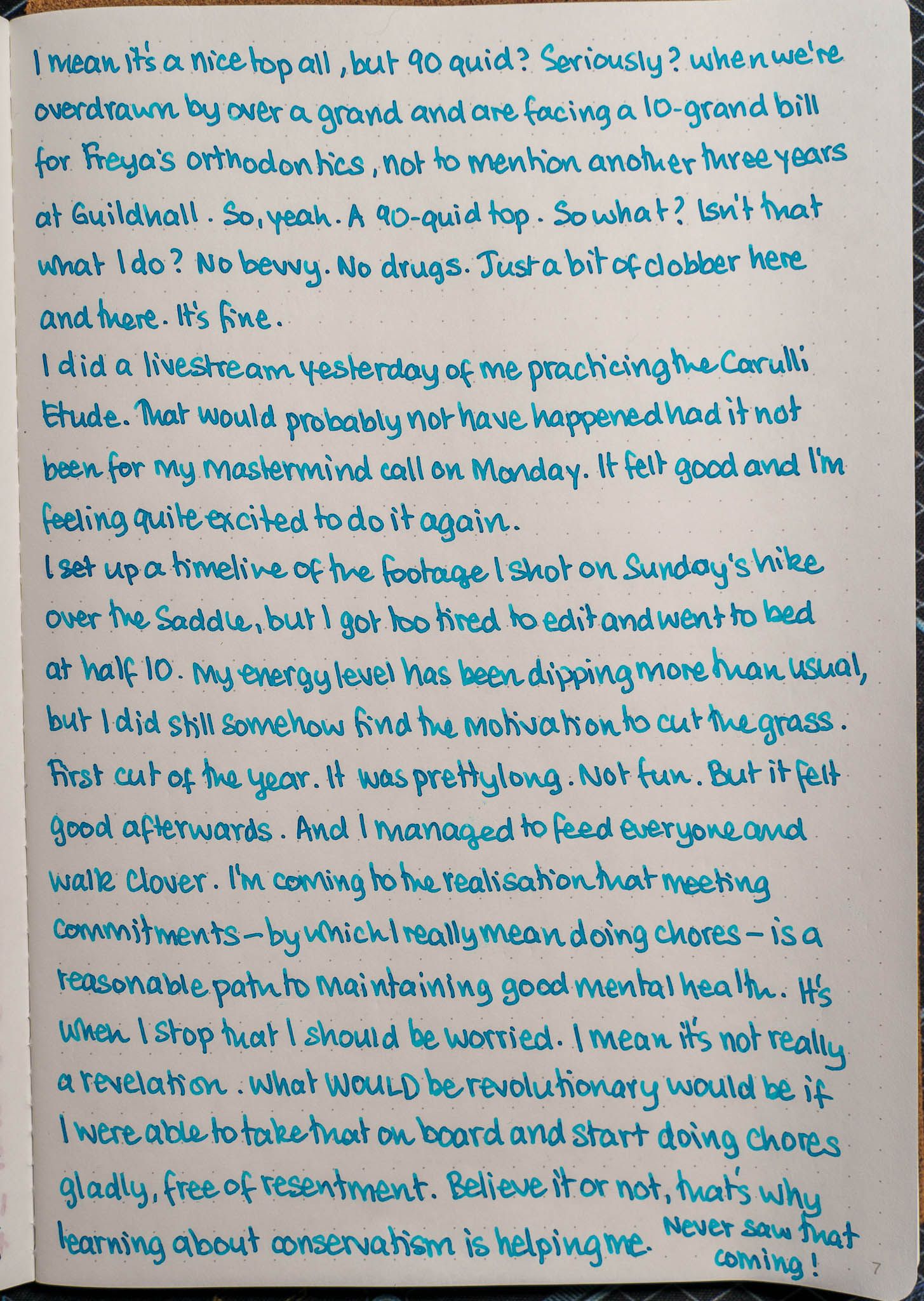 May 10, 2023 1 min read morning pages Morning Pages | 10 May 2023 Imagine doing chores gladly, free of resentment? That's my goal. Cams Campbell Trying on the Keela Merino HoodyLinksKeela Men's Merino HoodyOdyssey Orchestra InstagramLivestream Practicing Carulli Etude