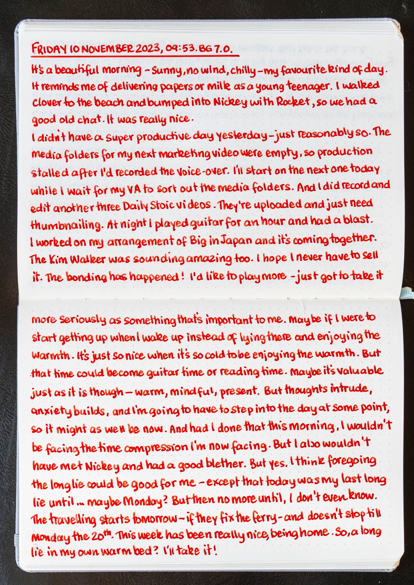 It's not ground-breaking writing today, but that's kind of the point - it's a habit. What comes out is what comes out. Overthinking it is not the goal. I just open up a blank page with a pen in my hand and see what happens.