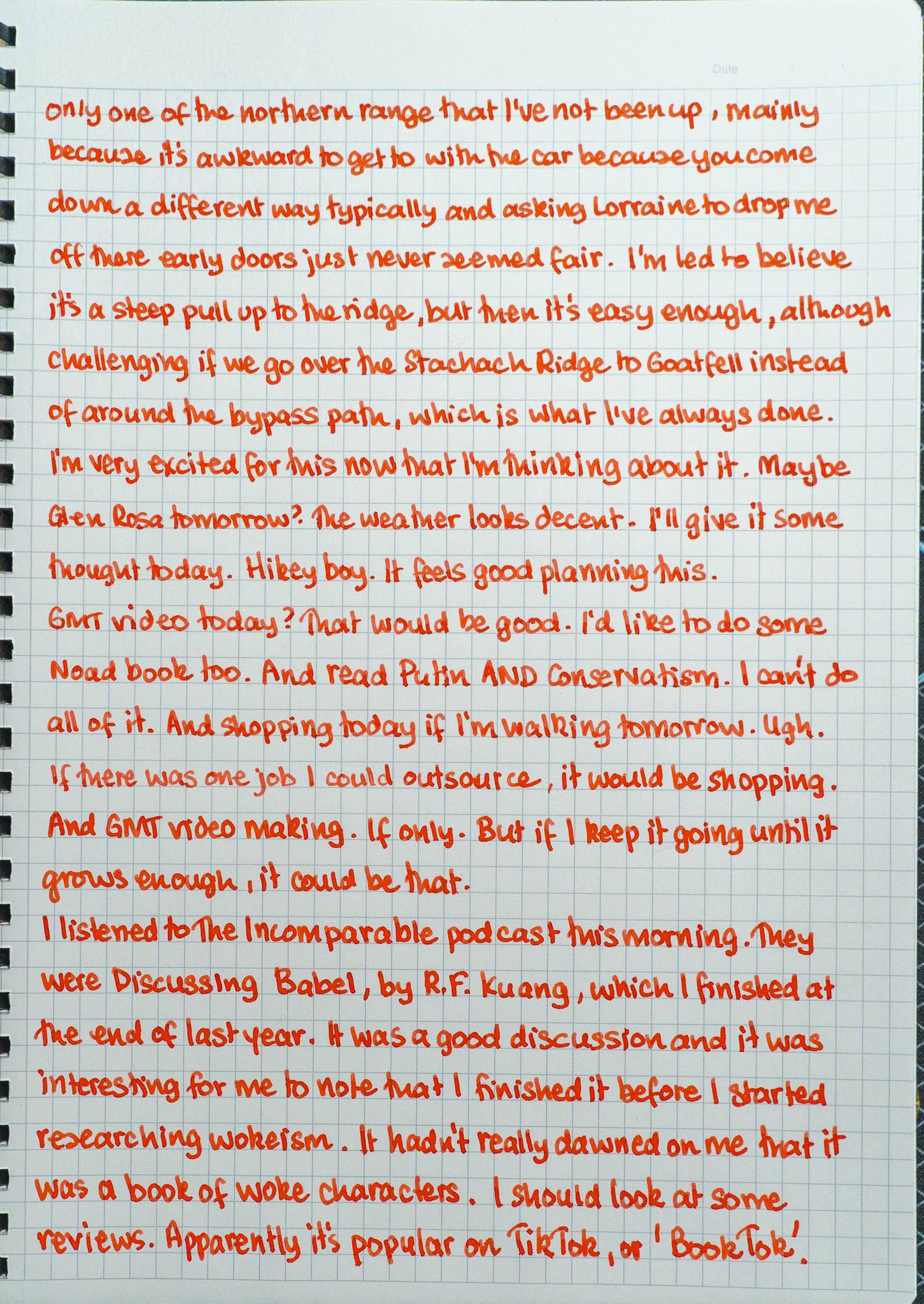 Feb 11, 2023 1 min read morning pages Morning Pages | 11 February 2023 I'm looking forward to hiking again. Cams Campbell LinksCioch na h-Oighe, Mullach Buidhe and Goatfell.Babel, or the Necessity of Violence: An Arcane History of the Oxford Tranlators' RevolutionThe Incomparable Book Club Episode