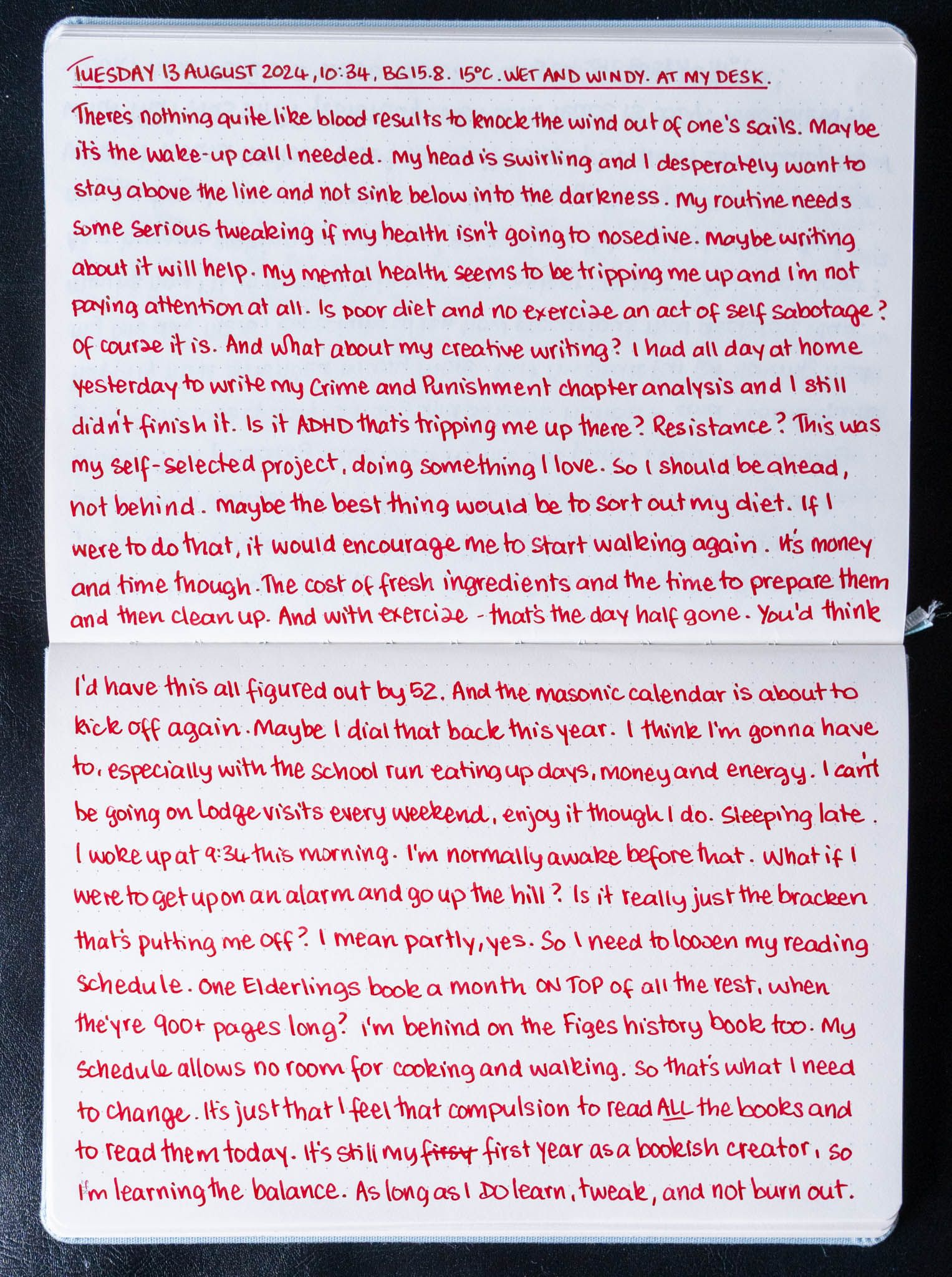 Aug 12, 2024 1 min read morning pages Morning Pages | 12 August 2024 You'd think I'd have this figured out by 52. Cams Campbell TWSBI Diamond 580ALR with J. Herbin Hematite Rouge