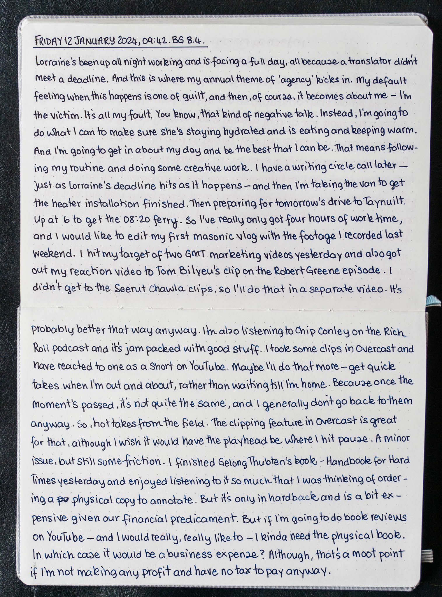 I'm experimenting with different content ideas as I go into 2024, and I think it's coming from my feeling relatively well, mentally speaking. The habits I built over 2023 are paying off, and I think that building up my content-creation around mental wellness would keep me in the wellness zone and serve as an example of just how powerful the creative act can be. It has me feeling quite excited, even as I sit here at 10.57 a.m. while my wife has been up working all night to meet a deadline and is still going. Normally that would cause me to spiral down into guilt and self-pity. I'm growing!