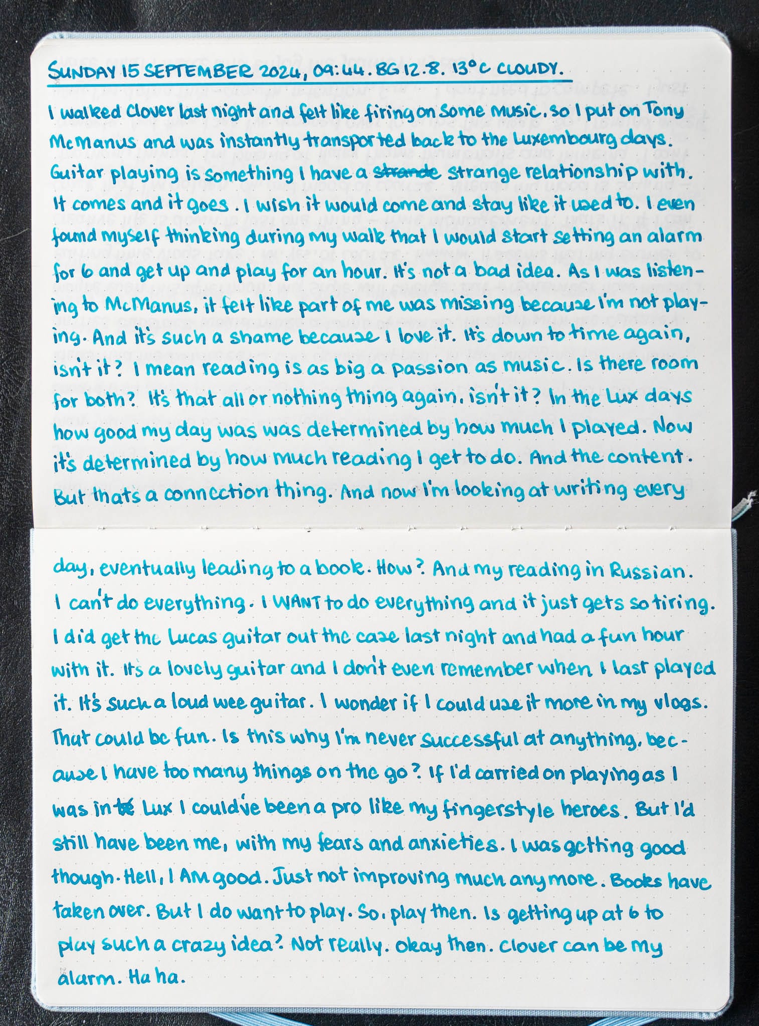 Sep 15, 2024 1 min read morning pages Morning Pages | 15 September 2024 I can't do everything. Cams Campbell Music and books. How do you balance multiple hobbies and passions? Graf von Faber-Castell Fuller Bentley Broad with Diamine Aqua Lagoon