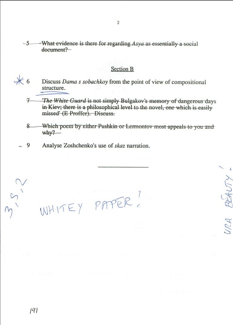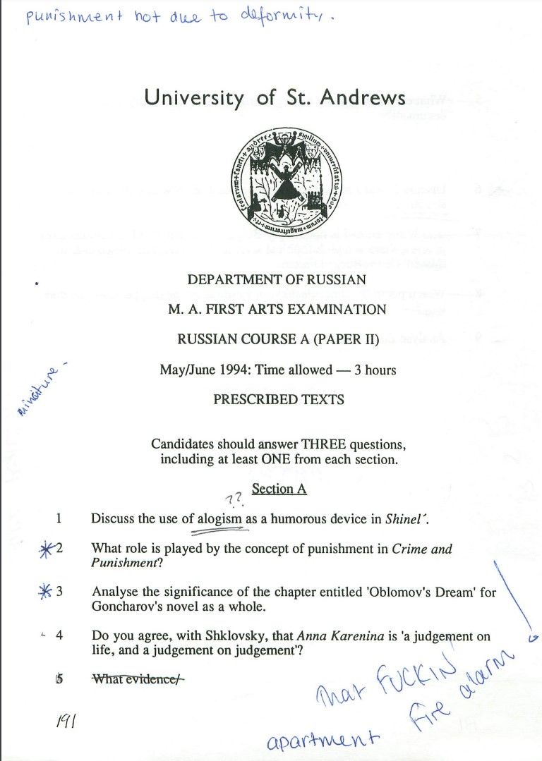 I wrote about how much I'm enjoying reading Crime and Punishment, and it inspired me to look up an old exam paper from my first year at St Andrews, when I was studying Russian language and literature. I would dearly love to read my essay paper from that exam. It sucks that we didn't get them back.