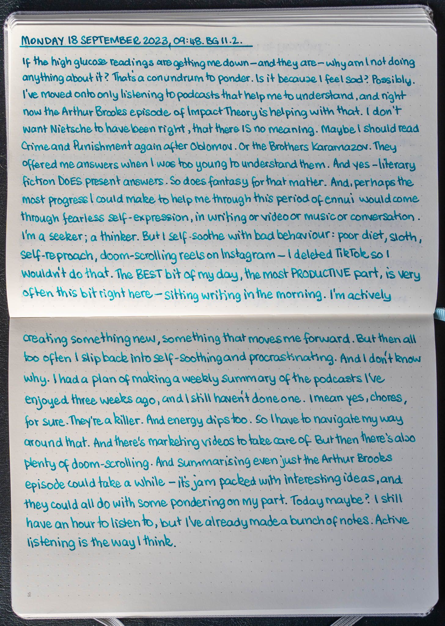 In the time between writing my pages and opening up this page to post it, my mood has slumped again. Whence comes depression? I can lift myself out of this; I know I can. I don't want medication, not again. Coming off the Citalopram in 2019 was horrible. So maybe I'll just fire right back into Impact Theory and take more notes. Yeah, that's what I'll do.