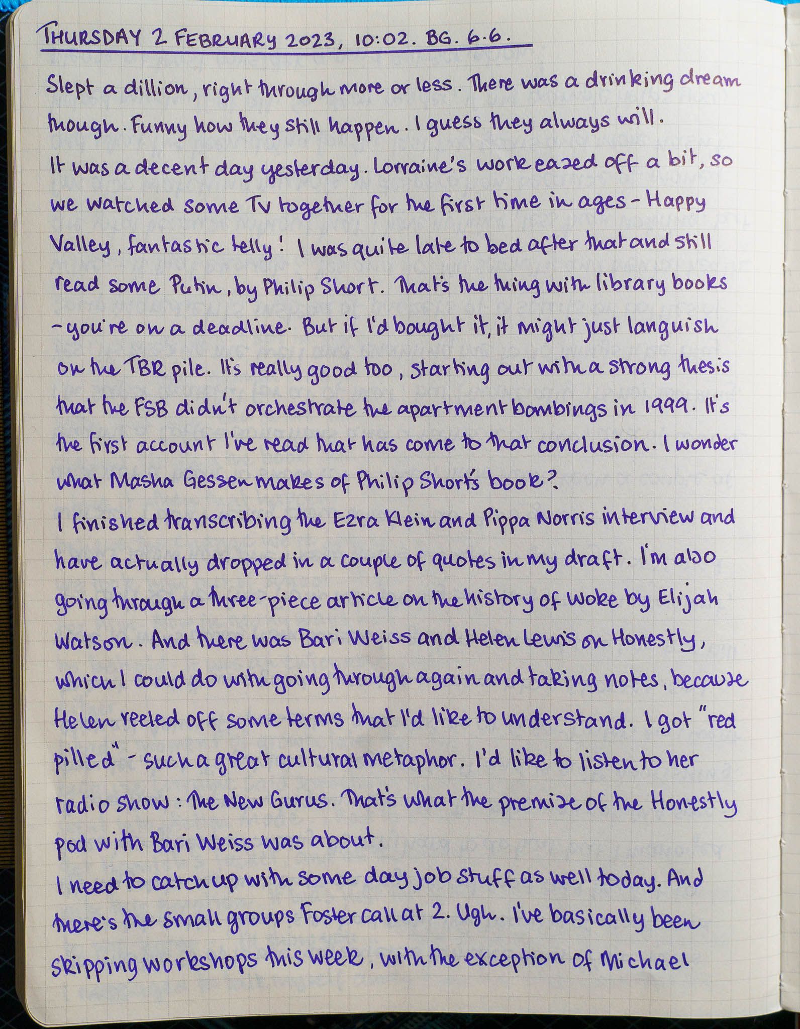 Feb 2, 2023 1 min read morning pages Morning Pages | 2 February 2023 I can prop this page up with two Fretboard Journals! Cams Campbell LinksPutin: His Life and Times, Philip ShortA Powerful Theory of Why the Far Right Is Thriving across the GlobeHonestly Pod with Bari Weiss and Helen LewisHow to Use Fear as a Tool for Growth, Michael AshcroftFretboard JournalHow Woke went from "Black" to "Bad"