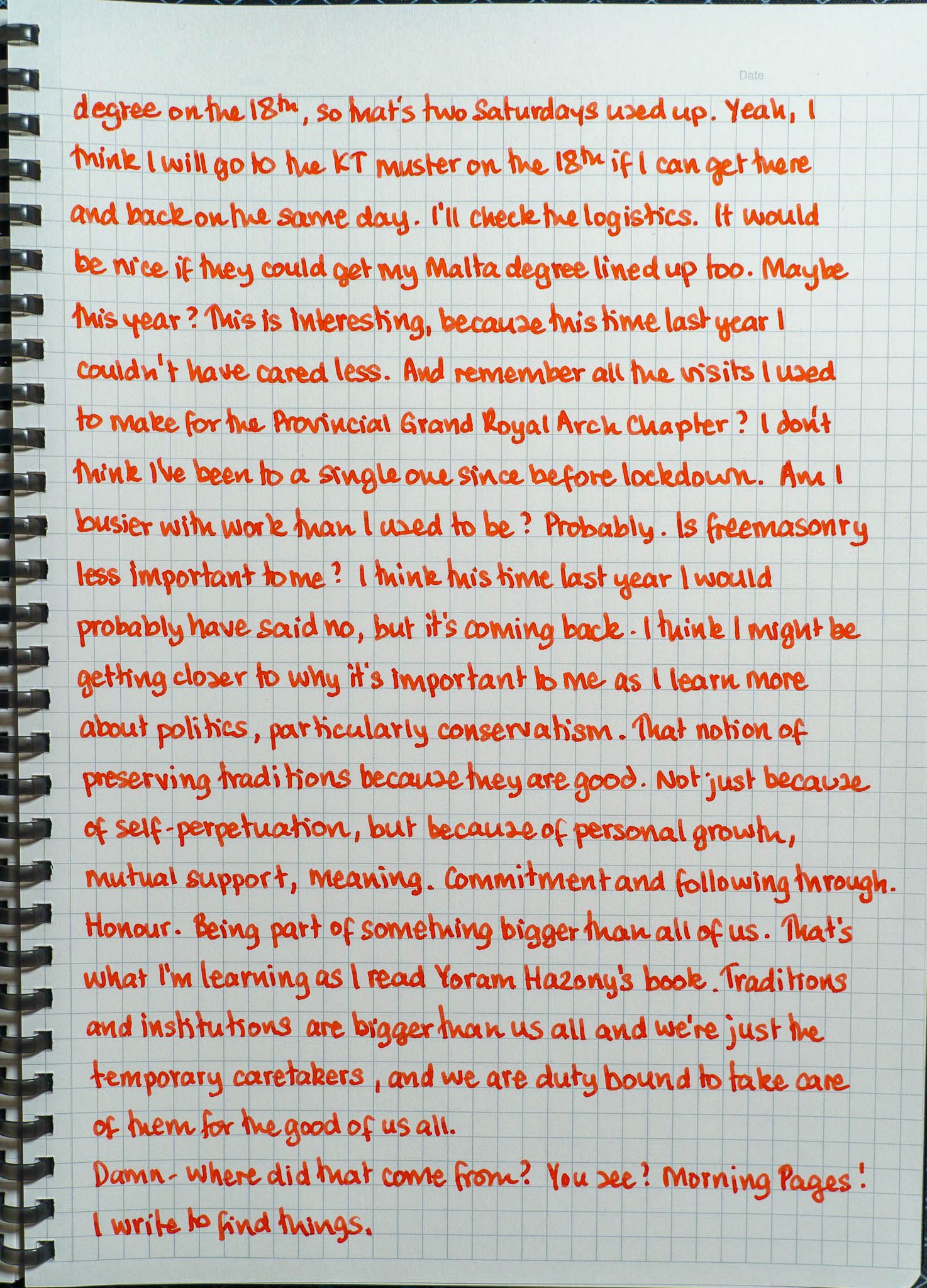 Mar 2, 2023 1 min read morning pages Morning Pages | 2 March 2023 Personal growth. Mutual Support. Meaning. Commitment. Honour. Cams Campbell LinksConservatism: A Rediscovery, Yoram Hazony