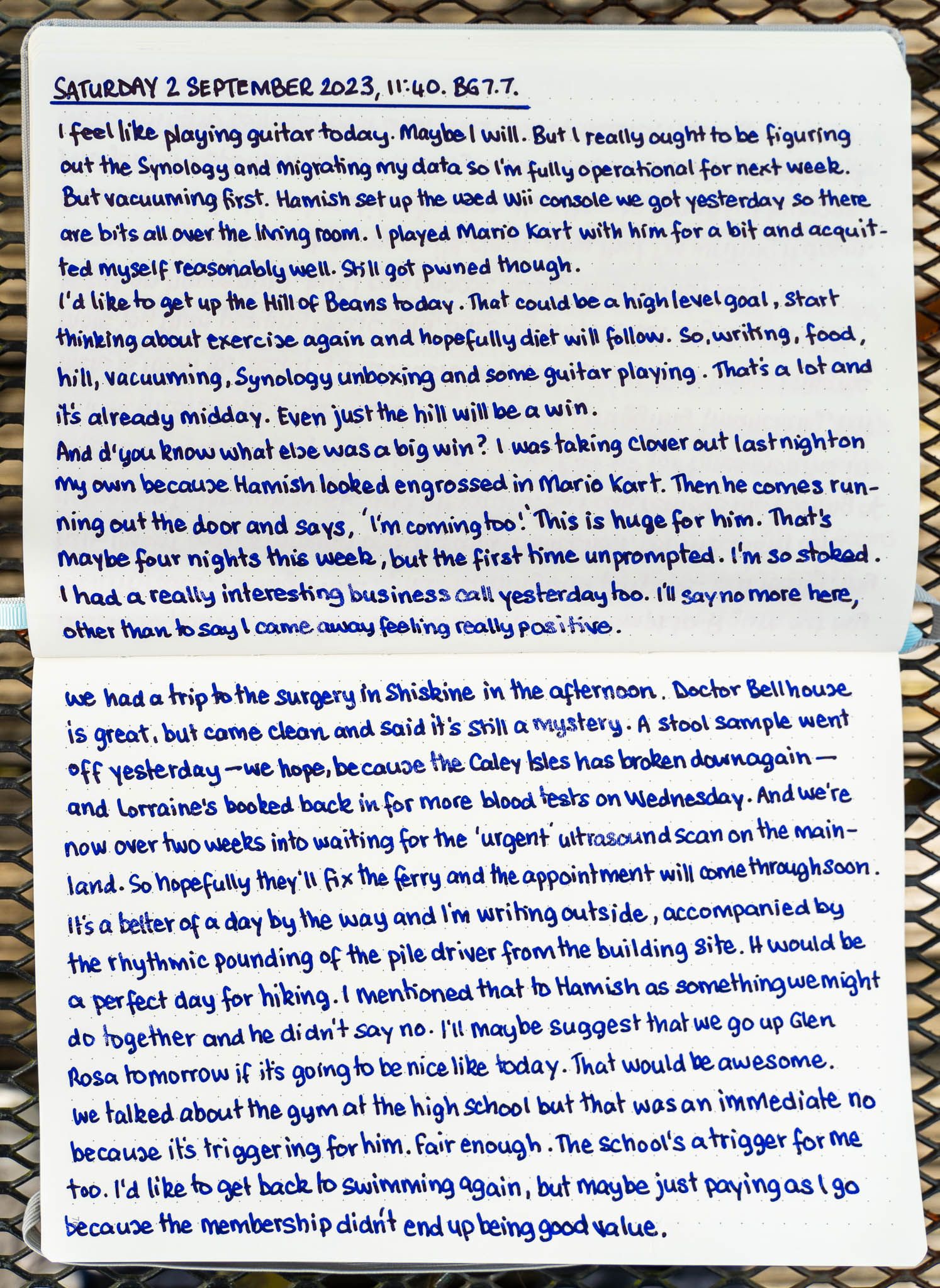 This was an outdoor session, so I live-streamed on my iPhone. I had a brief interruption when the neighbour came to ask if our cat had been beating up on his cat (she hadn't) and then I had to come in to write a message to Lorraine to ask her to bring the shears home from the field so I can go up the Hill of Beans later – it'll be overgrown again because I've not been up in a couple of weeks.
