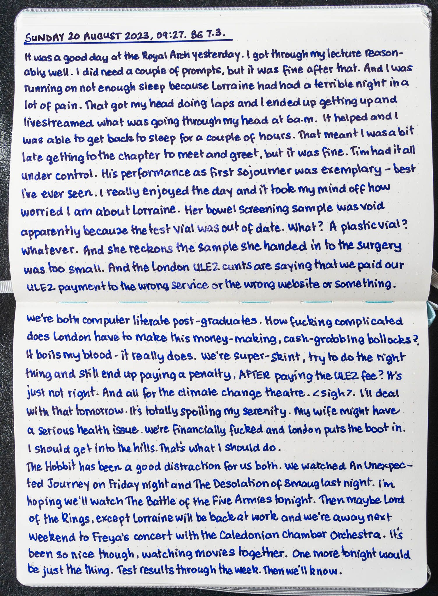 Sunday. Tired. But writing anyway. Waldmann Edelfeder broad with Diamine Bilberry.