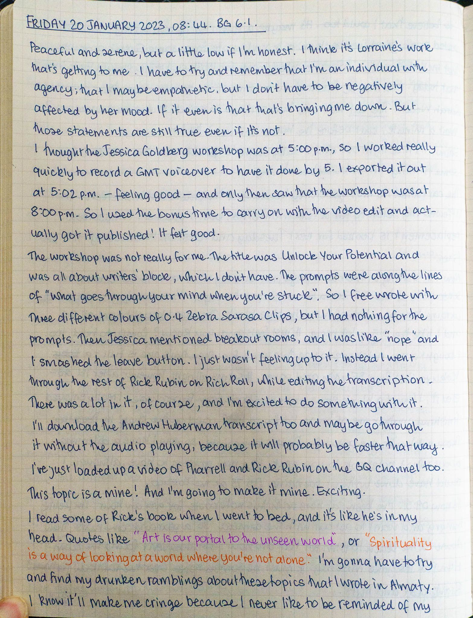 Jan 20, 2023 1 min read morning pages Morning Pages | 20 January 2023 Oi, Rubin! Get out of my head! Cams Campbell LinksRick Rubin on Rich RollRick Rubin on Andrew HubermanPharrell and Rick Rubin Have an Epic Conversation | GQThe Farseer Trilogy