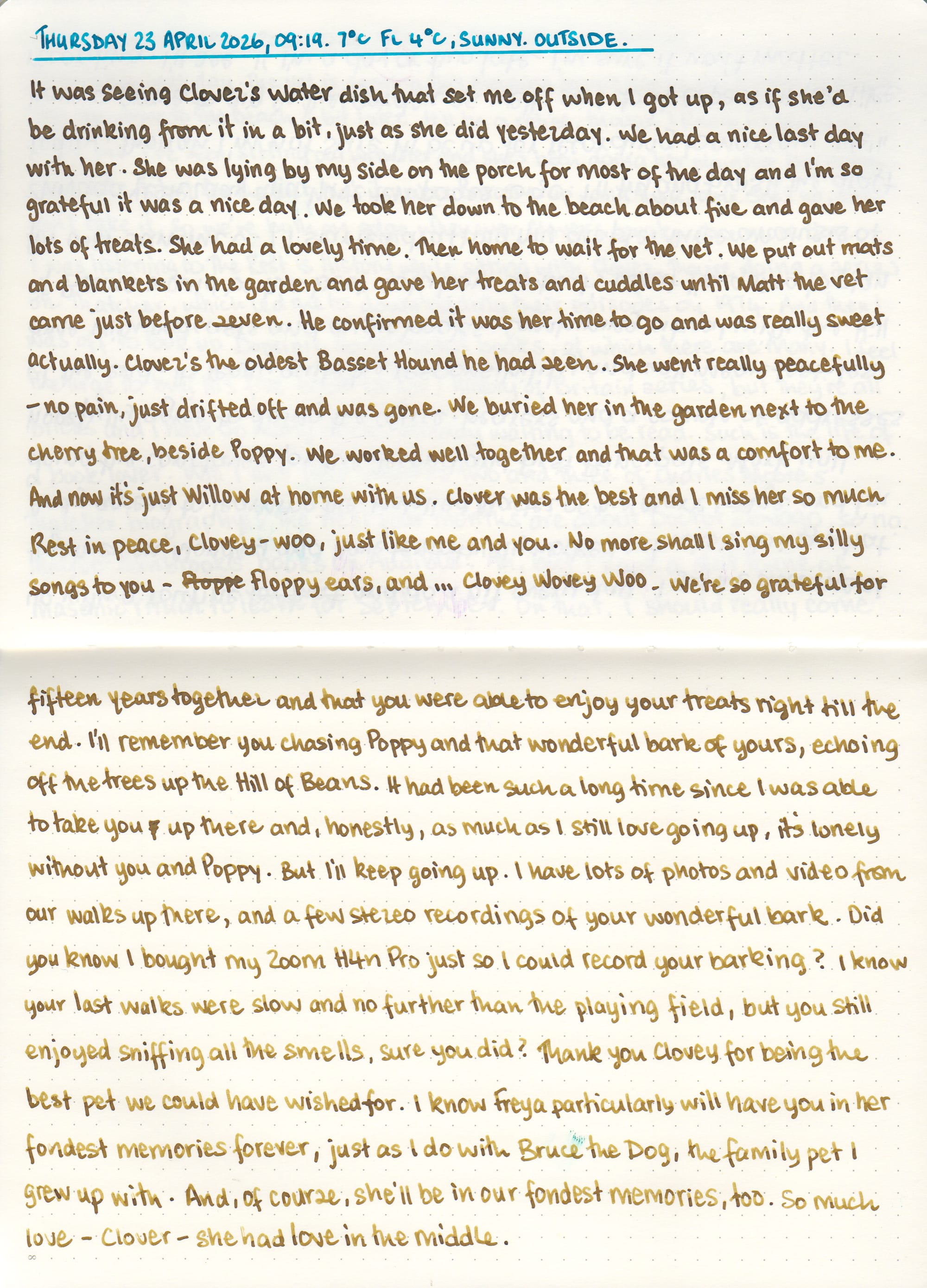 Apr 23, 2026 1 min read morning pages Morning Pages | 23 April 2026 Cams Campbell A tearful farewell to Clover. 🍀🐶TWSBI Classic Broad, Diamine Desert Burst