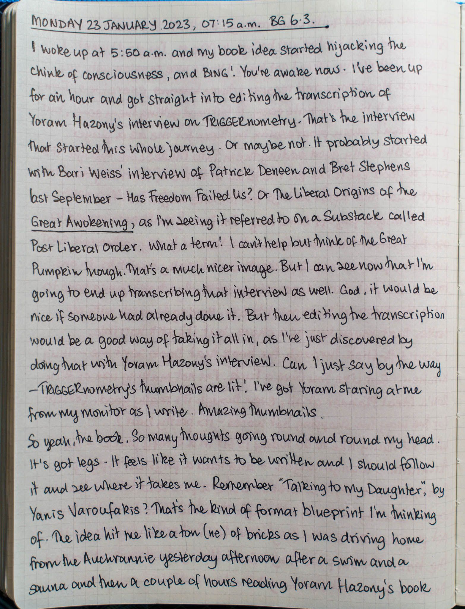 Jan 23, 2023 1 min read morning pages Morning Pages | 23 January 2023 Just do the words. The rest will work itself out. Cams Campbell Reading by the fire at the Auchrannie Hotel in Brodick LinksTalking to my Daughter: A Brief History of Capitalism, by Yanis VaroufakisYoram Hazony on TRIGGERnometryConservatism: A Rediscovery, Yoram HazonyHas Freedom Failed Us?, Bari Weiss interview with Patrick Deneen and Bret Stephens