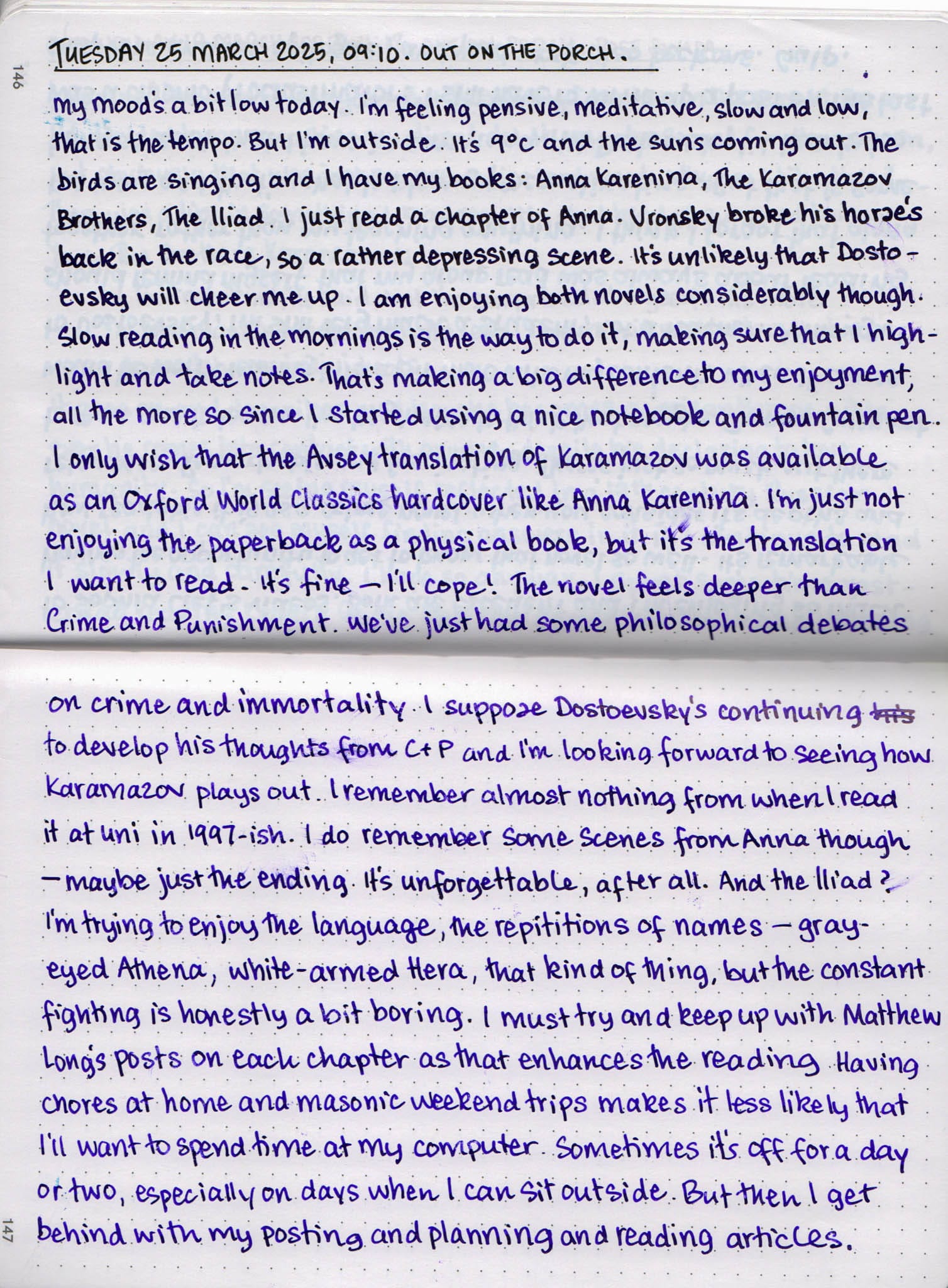 Mar 25, 2025 1 min read morning pages Morning Pages | 25 March 2025 Slow and low that is the tempo Cams Campbell A chilly outdoor writing sesh. TWSBI Diamond 580ALR with Diamine Bilberry InkMatthew Long's posts on The Iliad