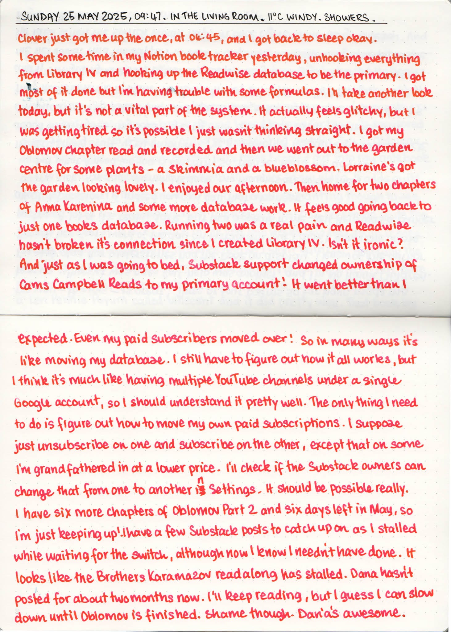 The Substack publications are now both on this profile! And the two Notion books database are becoming a singular books database. I initially made another one in frustration when the Readwise connection to its Notion database broke for the fourth time and I had to start again from scratch. That was over a year ago and it hasn't broken again since then, so I hope I'm safe in going back to just the single Readwise db as canononical.