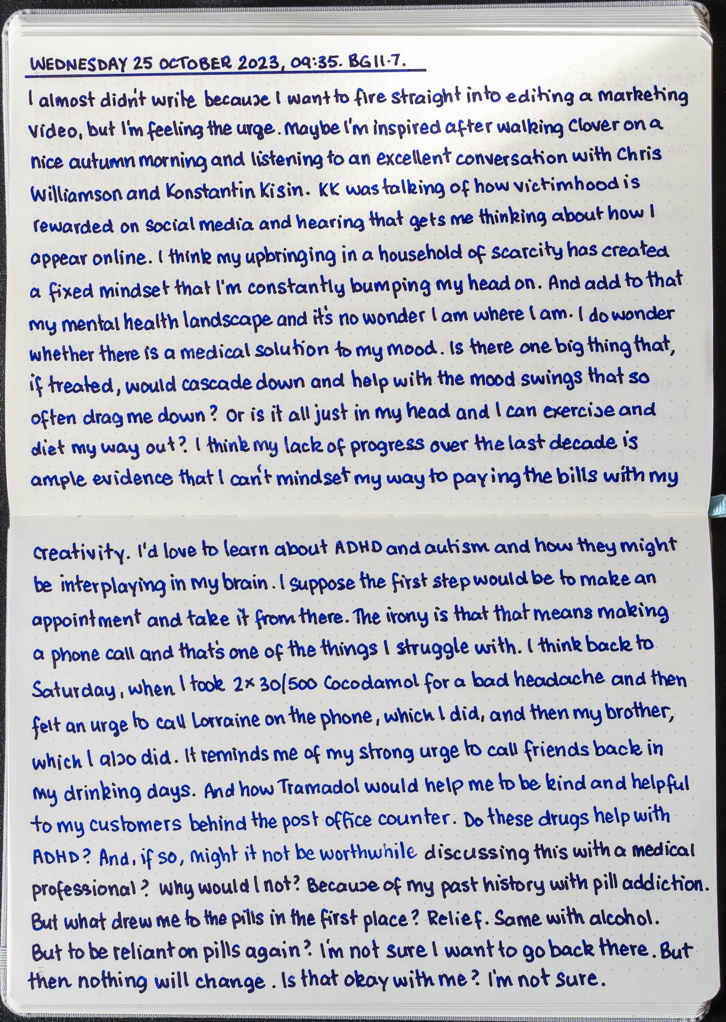 I found myself pondering the idea of whether medication could provide a solution for me. It's something I keep coming back to and then discarding, mainly because of my fear of becoming dependent on medication. Without going into it too much here, I spent many years relying first on alcohol, and then opioids, without really understanding why. Now that I'm thinking about the interplay between autism and ADHD, it has me wondering whether these are the issues that I was using drugs and alcohol to find relief from. I could be barking up the wrong tree, but I could also be onto something that warrants further exploration.