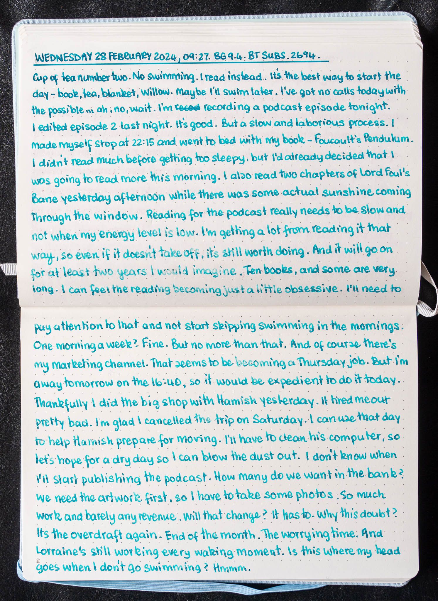 Today's writing started to get quite dark as I got towards the end—the old financial situation coming into my head again. I'm choosing to believe that it's partly caused by not having gone swimming and done the post-swim meditation I've been doing: an interesting observation for sure.
