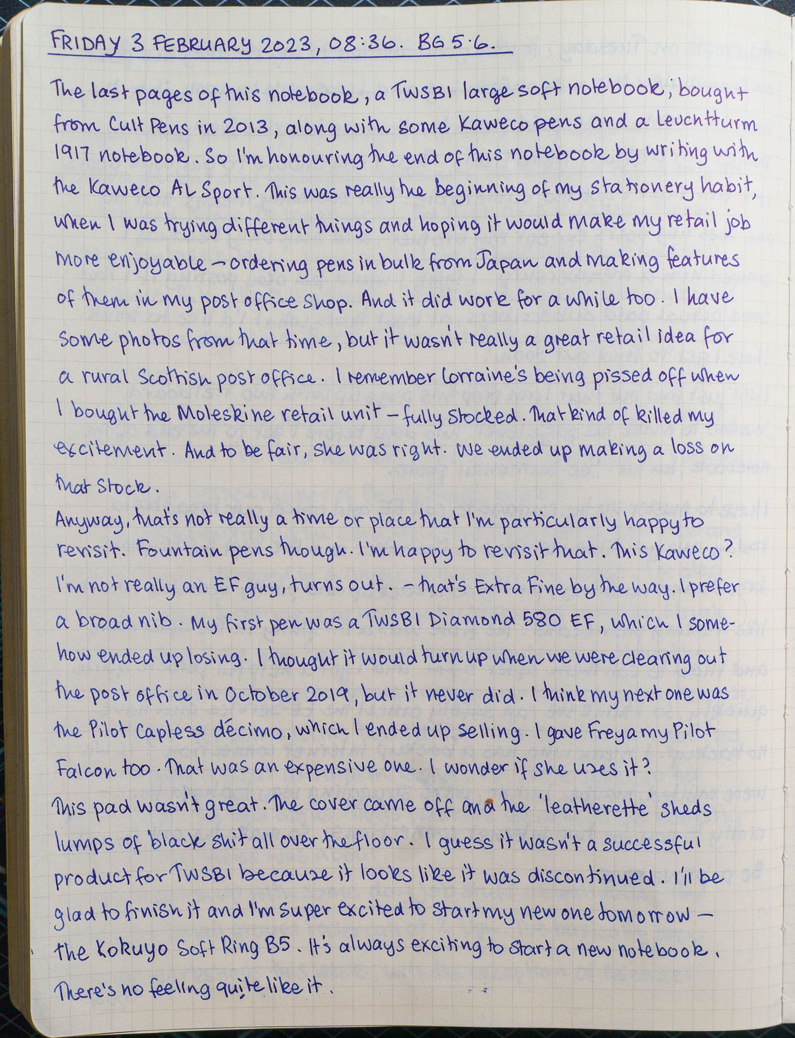 The last pages of my TWSBI Softcover Large notebook. It's always exciting to reach the end of a notebook and it got me thinking about when I bought it in 2013.
