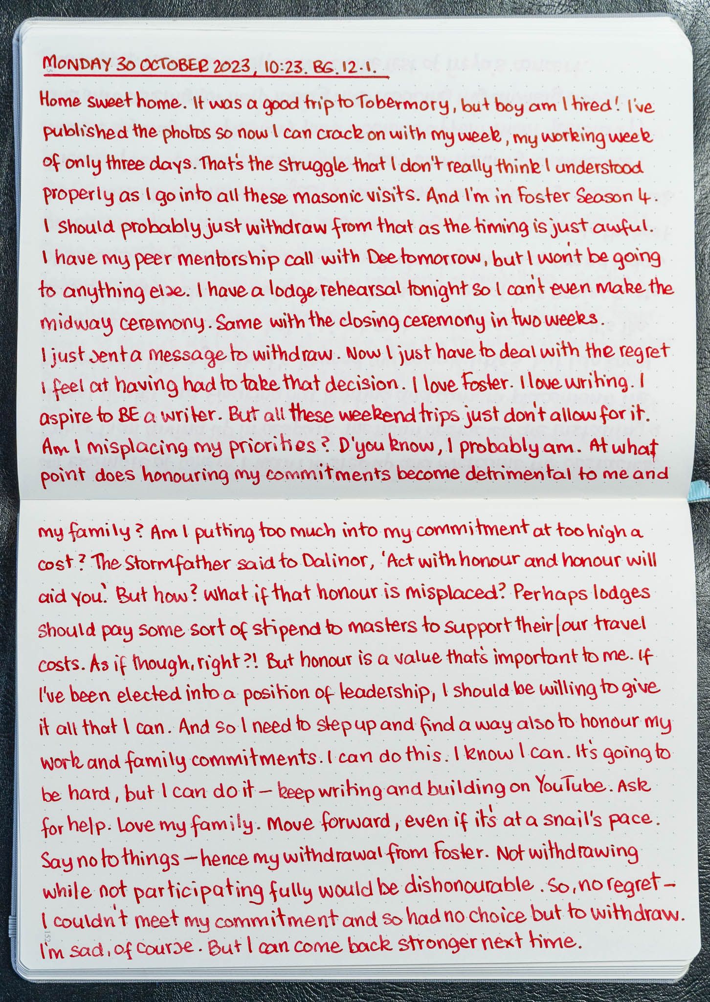 I've included a gallery of the pages that I wrote while I was travelling so you can get a sense of what was going through my mind on the trip. It adds context to the decision I came to today to withdraw from a writing course that I enjoy and that adds value to my life in a very big way. Balancing commitments can be tricky and it takes exploration and analysis to reach decisions like the one I took today to withdraw from Foster Season 4. It makes me sad, but, at the same time, I feel that I've acted honourably. I'd be interested to hear whether you agree. I could quite easily have made the wrong choice. Lord knows, it wouldn't be the first time!