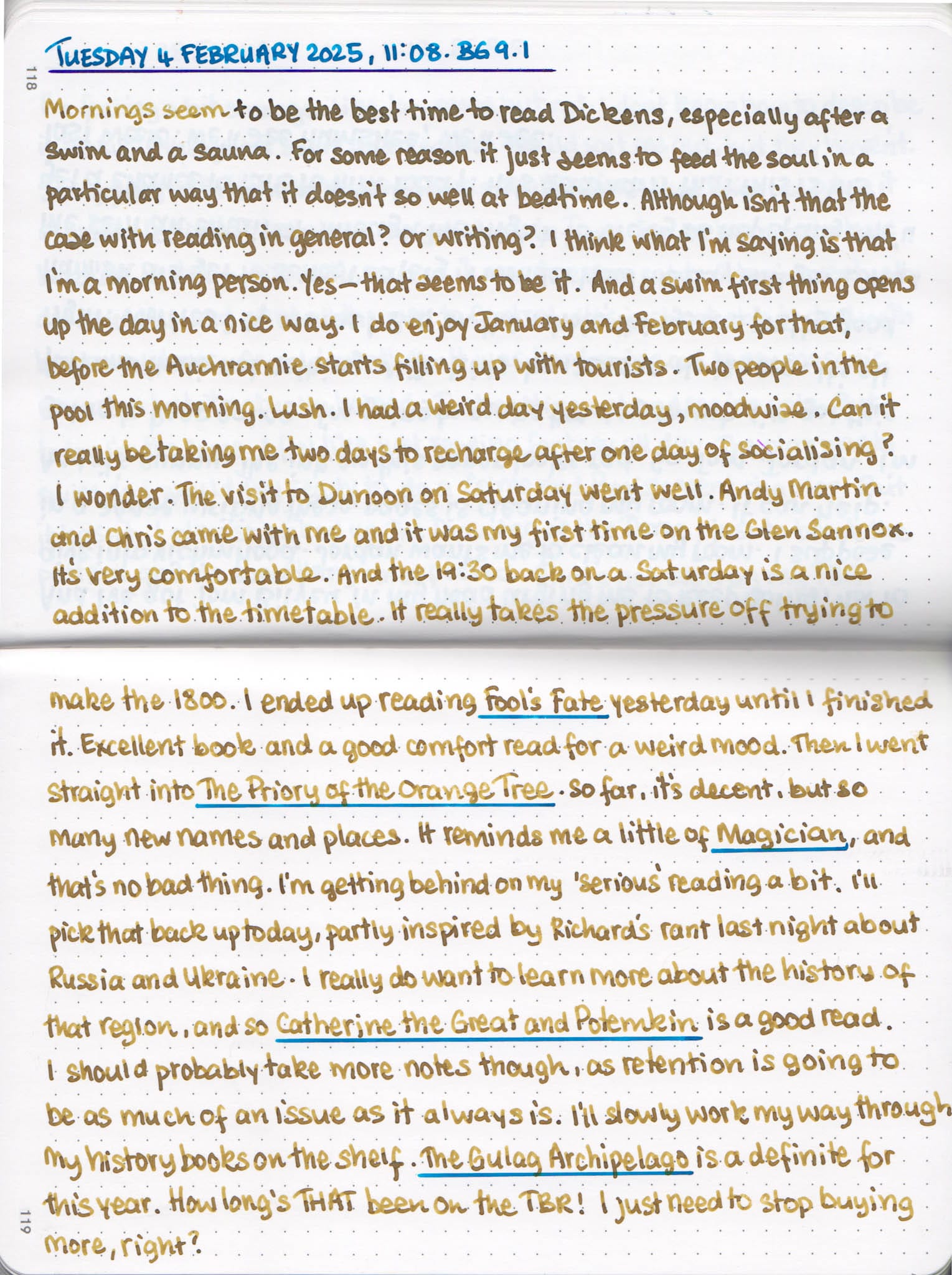 Feb 4, 2025 1 min read Morning Pages | 4 February 2025 Cams Campbell The pages are slipping a bit. I need to watch that. TWSBI Classic Broad with Diamine Desert BurstLinksFool's Fate, Robin HobbThe Priory of the Orange Tree, Samantha ShannonMagician, Raymond E. FeistCatherine the Great and PotemkinThe Gulag Archipelago, Alexander Solzhenitsyn