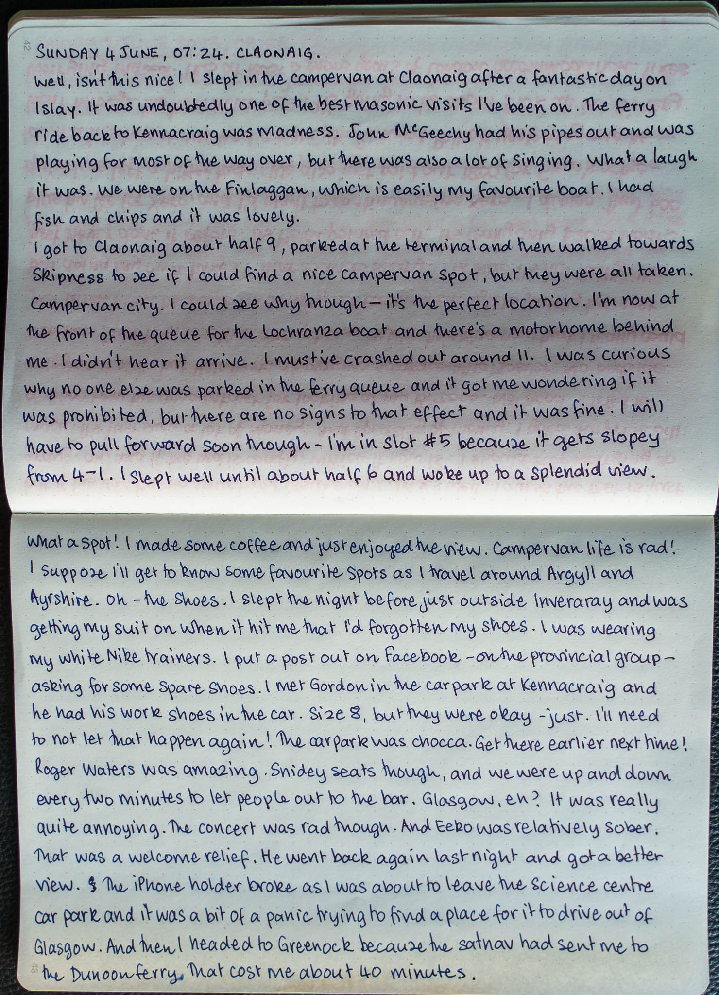 A special edition this morning, written from my new campervan at the side of the water, waiting for the 10:05 ferry from Claonaig to Lochranza to get home after two nights away.