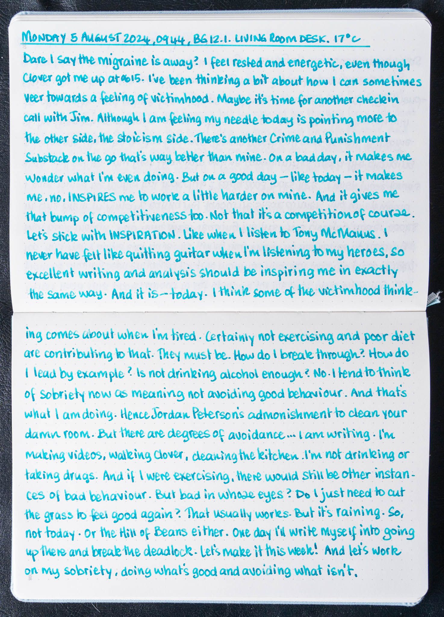 Aug 5, 2024 1 min read morning pages Morning Pages | 5 August 2024 Let's stick with INSPIRATION. Cams Campbell I'm choosing inspiration over dejection. Pelikan M600 Broad with Edelstein ApatiteLinksDana's Crime and Punishment Substack"Clean your damn room!"Tony McManus