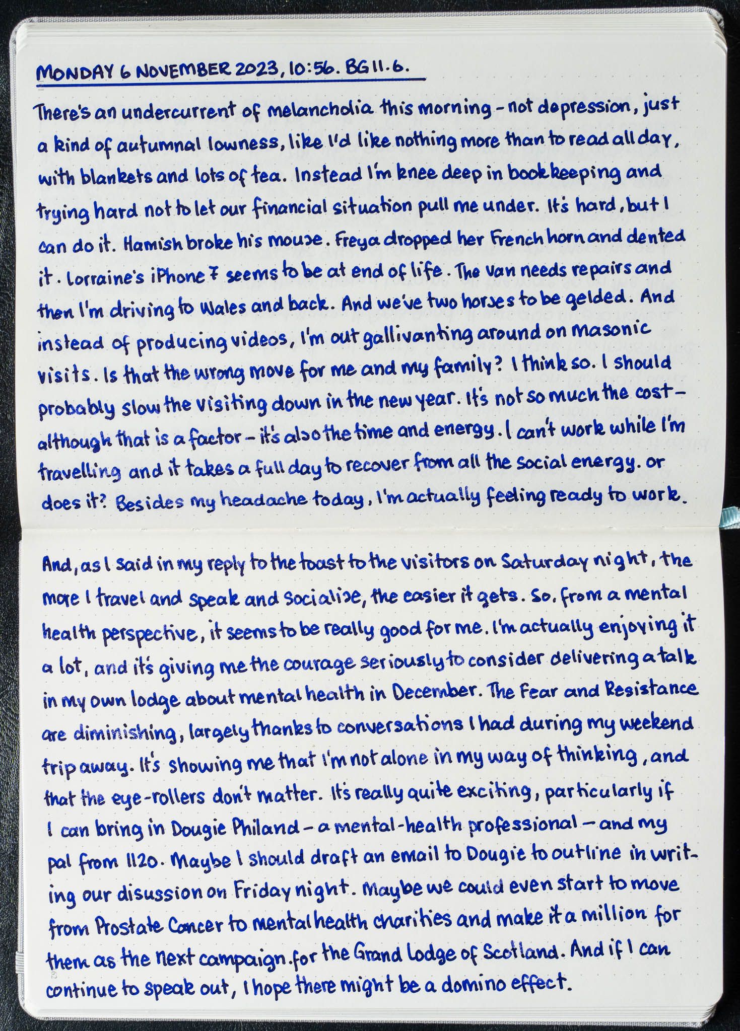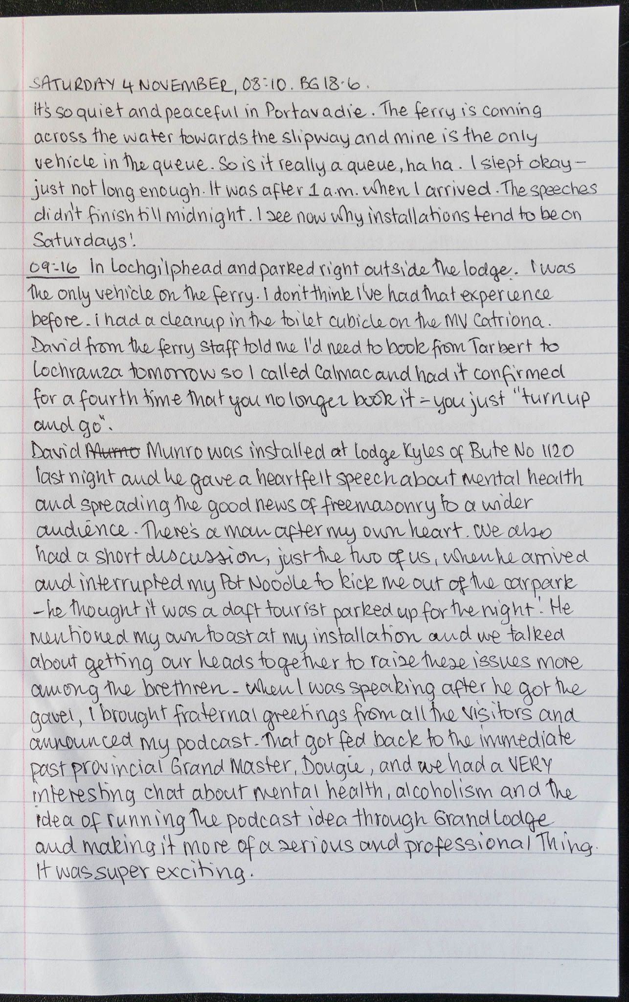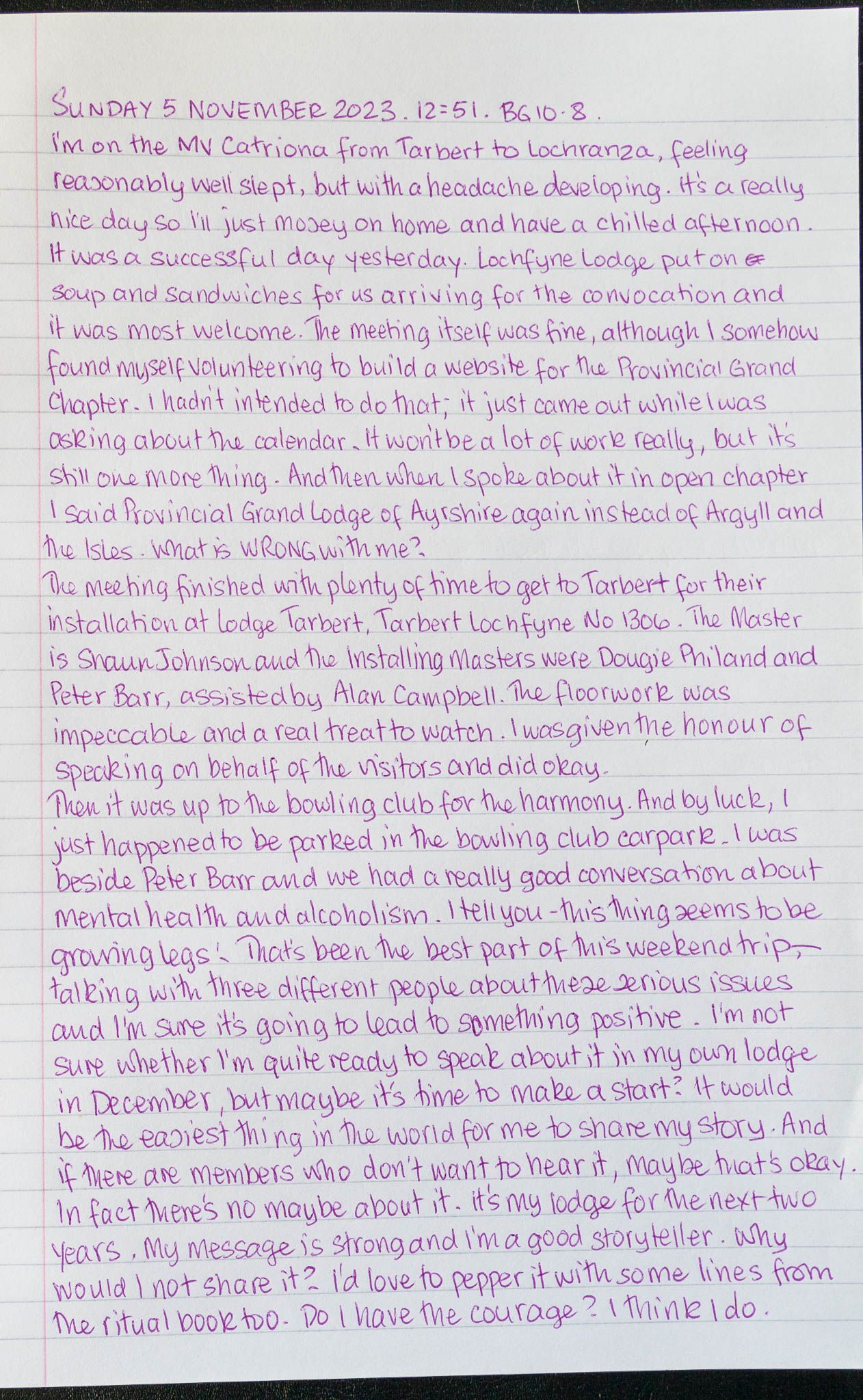 I wrote in my pages about the speech that the Master of Lodge Kyles of Bute No 1120 made after being installed for his second term. It's given me the courage to continue on my path and draft a talk to deliver at my own Lodge's meeting in December. It feels like there's a bit of a groundswell of mental health awareness happening in Argyll Freemasonry at the moment, and it's a delightful thing to be part of. My biggest challenge is stepping through the fear, but that's always been my biggest fear if I think about it. And that's something that being a Freemason gives me: a safe space to stand up in a roomful of more experienced men and take part in ritual, delivering toasts and bonding. And sharing that with a broader audience is exactly why I'm launching a podcast about it.