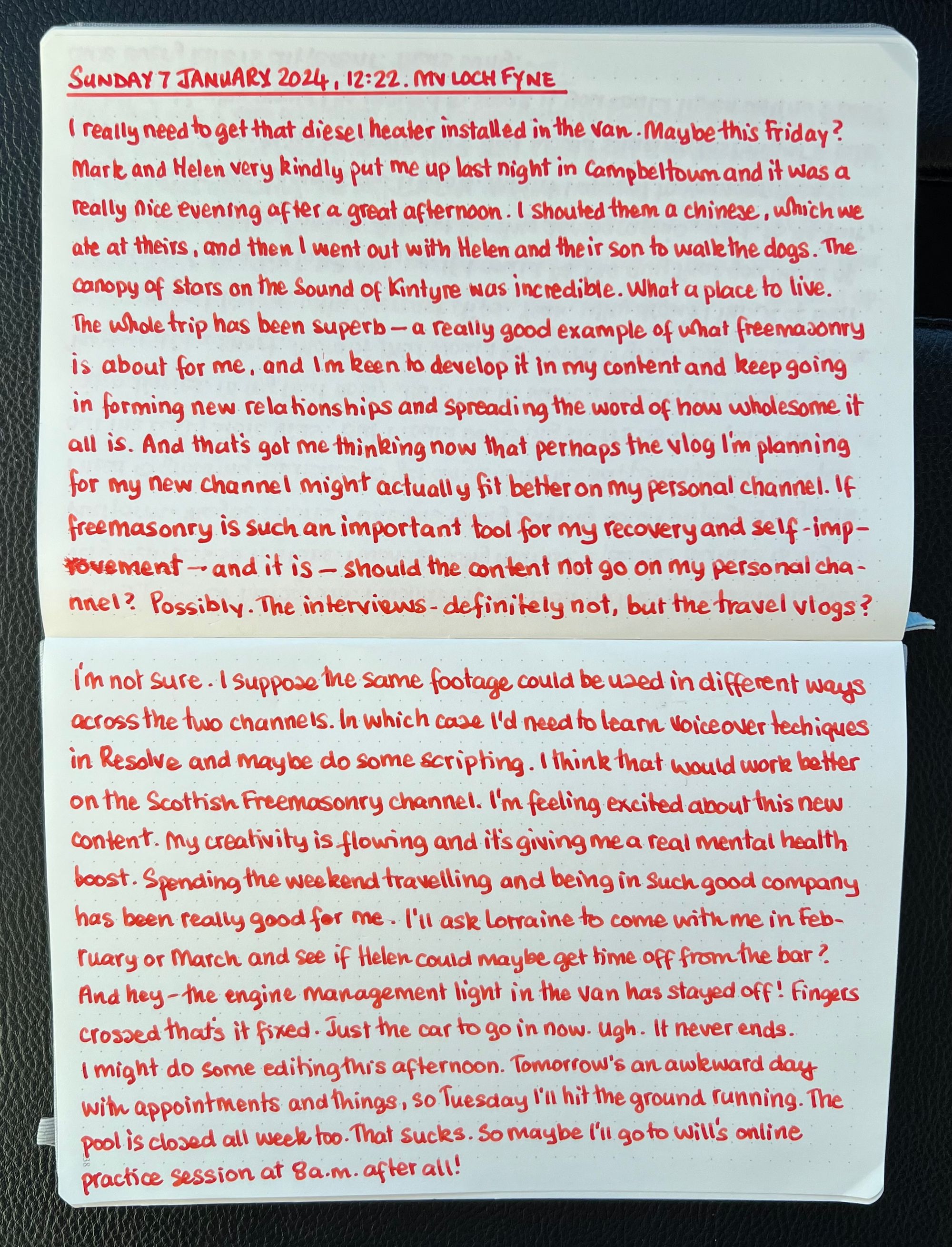 Another writing session on the road, this time on the MV Loch Fyne, travelling from Tarbert to Lochranza. It's been a fantastic weekend of friendship and human connection; and now my creative juices are flowing, hopefully into some interesting video content. That's what came up today's pages.