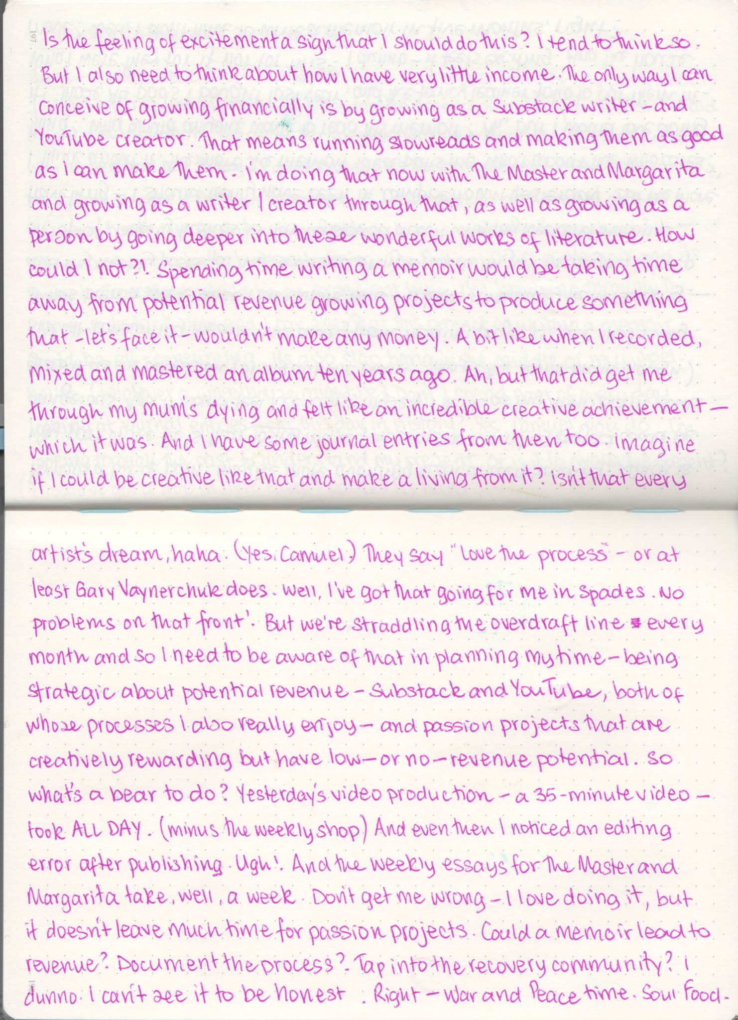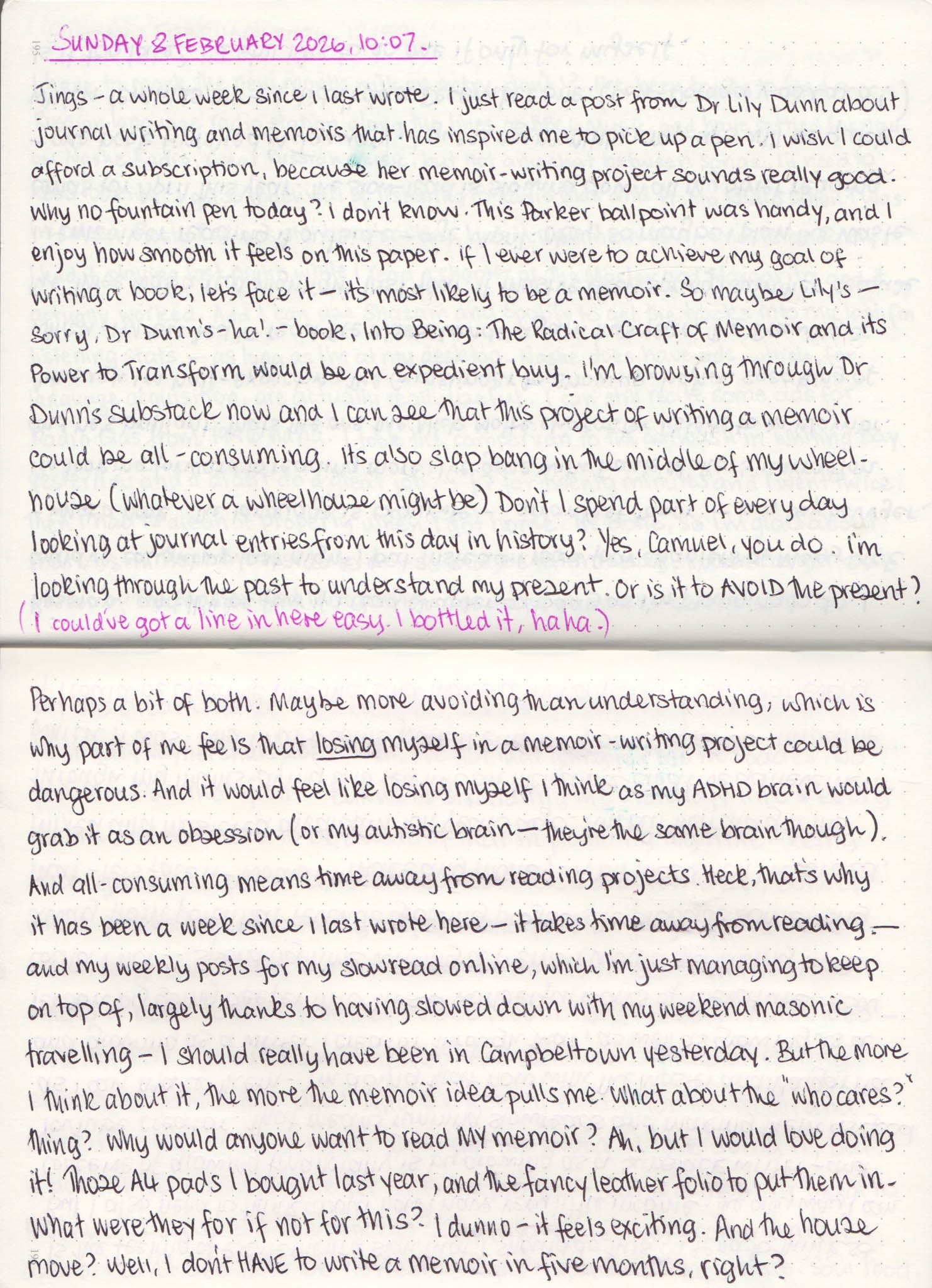 I wrote two double pages this morning and really enjoyed it. I picked the pen up after reading a Substack post about writing a diary and a memoir by Dr Lily Dunn. How could I not pick the pen up after reading that?
